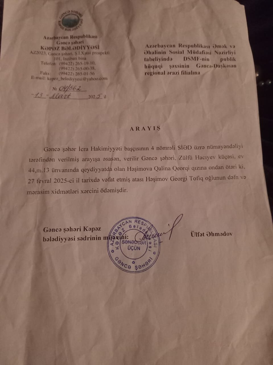 Gəncə şəhər Sevinc qəsəbəsi küçə 8 də yaşayan Həşimova Qalina Qeorgi qızı tərəfindən