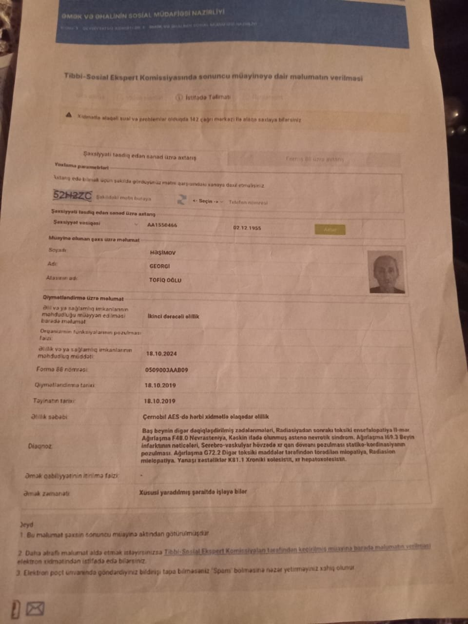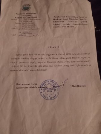 Yazıb diqqətinizə çatdırıram ki, atam Həşimov Georgi Tofiq oğlu Çernobıl vetiranı 2 ci qrup əlil olub və hər zaman dövlət qayğısı ilə əhatə olunub. Əlbəttə ki, bu sözləri ifadə etmək bir övlad kimi mənim üçün çox çətindir. Belə ki, atam 26 Fevral 2025 cı il tarixdə dünyasını dəyişib. Lakin dövlətimizin hər bir vətəndaşına verdiyi kəfən pulunu Çernobıl əlili olan atama vermirlər. Məlumat üçün bildirim ki, bu barədə aidiyyəti qurumlara müraciət etsəm də mənə başdan soydu, absurt cavab verərək məni başlarından edirlər. Ancaq ölkəmizin mövcud qanunvericiliyinə əsasən dünyasını dəyişən hər bir şəxsə əgər pensiya alırsa həmin ayın nəzərdə tutulmuş pensiyası eləcə də kəfən pulu ödənilir. Amma təəssüflər olsun ki, Çernobıl əlili olan mərhum atama bu ödənişin heç biri verilmədi.