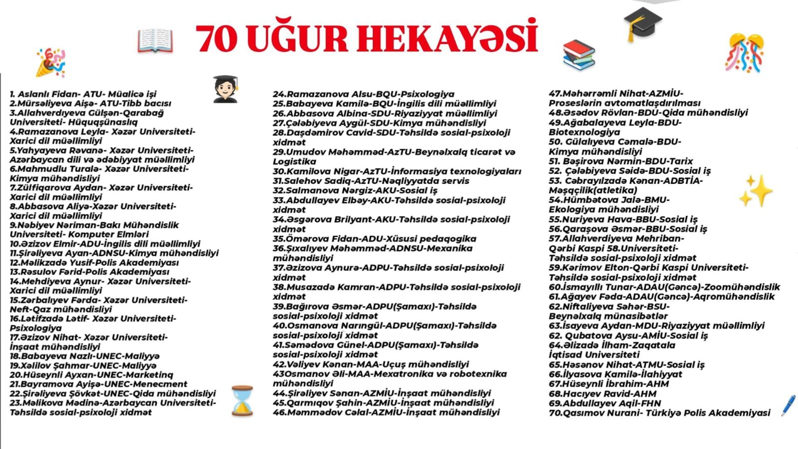 Bu il 70 şagirdim tələbə adını qazandı. 70 simvolik rəqəm də ola bilər.70 gənc gələcəyin 70 ümidi,dövlətə və dövlətçiliyə sadiq vətəndaşıdır.