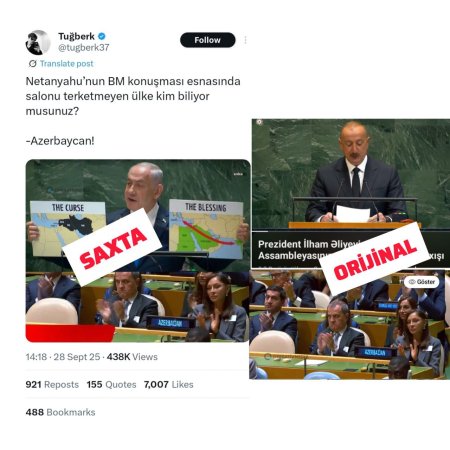 Turkdunyasi.az Axar.az-a istinadən xəbər verir ki, İsrail Baş naziri Benyamin Netanyahunun BMT Baş Assambleyasında çıxışı zamanı Azərbaycan nümayəndə heyətinin guya əl çaldığı haqda məlumat tirajlanır.