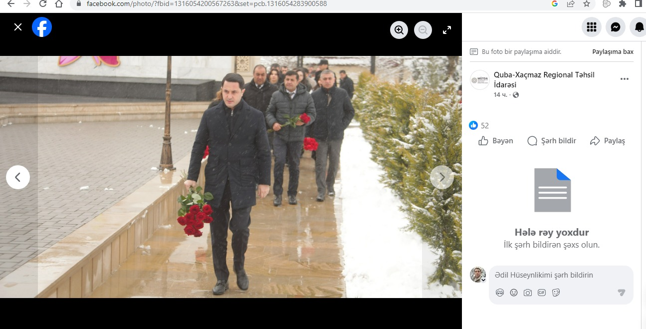 Lakin paylaşılan fotolar arasında diqqət çəkən və ictimai narazılığa səbəb olan bir məqam da yer alıb. Belə ki, fotolardan birində Quba-Xaçmaz Regional Təhsil İdarəsinin müdiri Coşqun Əliyevin rayonda saxlanılan Sovet ordusu əsgərinin abidəsi üzərinə də qərənfil qoyduğu görünür.