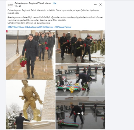 Quba-Xaçmaz Regional Təhsil İdarəsi ziyarətlə bağlı fotoları “Facebook” sosial şəbəkəsindəki rəsmi səhifələrində paylaşıb. Fotolarda idarənin müdiri Coşqun Əliyev və kollektiv üzvlərinin şəhidlərin məzarları üzərinə qərənfil qoyduğu əks olunub.