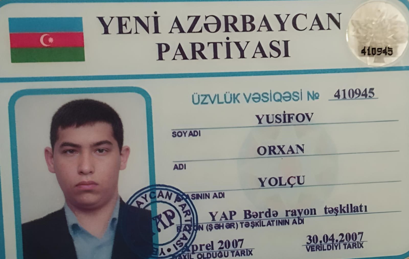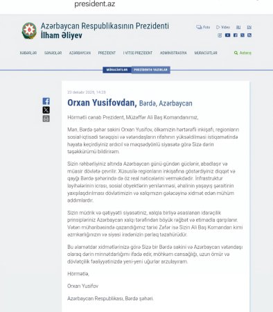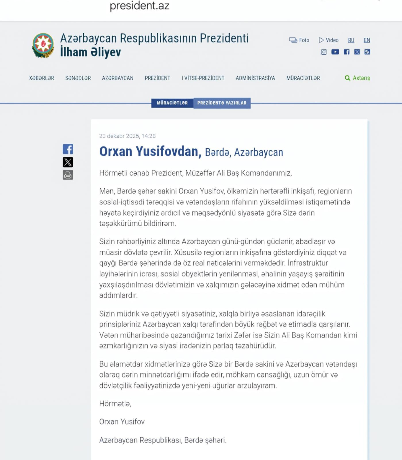 Mən, Bərdə şəhər sakini, ictimai fəal, 2007-ci ildən Yeni Azərbaycan Partiyasının üzvü Orxan Yusifov, Sizə böyük ümid və inam hissi ilə müraciət edirəm.