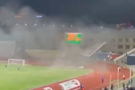 Qazaxıstanın Çimkənd şəhərində futbol matçı zamanı güclü külək nəticəsində stadionun damı uçub.