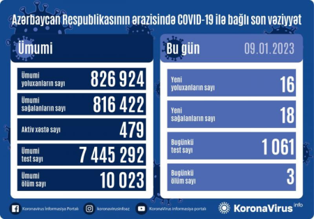 Azərbaycanda indiyədək ümumilikdə 826 924 nəfərin koronavirus infeksiyasına yoluxması faktı müəyyən edilib. Onlardan 816 422 nəfər müalicə olunaraq sağalıb, 10 023 nəfər vəfat edib, aktiv xəstə sayı 479 nəfərdir.