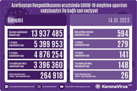 Vurulan vaksinlərin ümumi sayı 13 937 485, birinci mərhələ üzrə vaksinasiya olunanların ümumi sayı 5 399 953, ikinci mərhələ üzrə vaksinasiya olunanların sayı 4 876 254, üç və daha çox doza üzrə vaksinasiya olunanların sayı 3 396 360, pozitiv nəticədən sonra buster doza üzrə vaksinasiya olunanların sayı isə 264 918 nəfər təşkil edir.