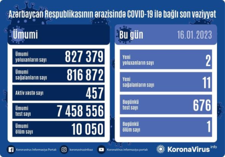 Azərbaycanda indiyədək ümumilikdə 827 379 nəfərin koronavirus infeksiyasına yoluxması faktı müəyyən edilib. Onlardan 816 872 nəfər müalicə olunaraq sağalıb, 10 050 nəfər vəfat edib, aktiv xəstə sayı 457 nəfərdir.