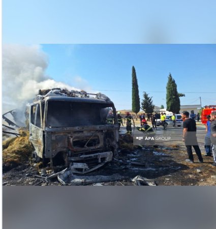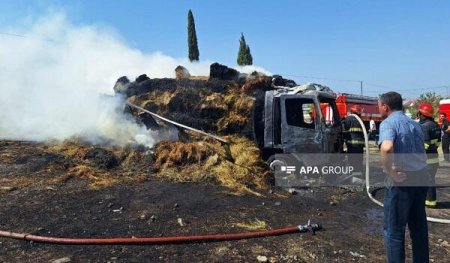 Şəmkirdə ot daşıyan yük maşını yandı - Foto
