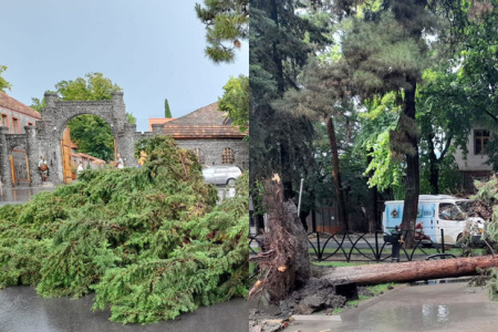 Qaxda güclü külək istirahət parkında ağacları aşırdı - FOTO