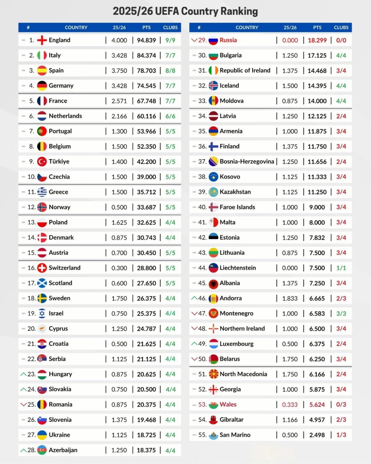 Müəyyən səbəblərə görə UEFA bayrağı altında keçirilən yarışlardan kənarlaşdırılan Rusiya 18.299 xalla 29-cu pilləyə geriləyib.