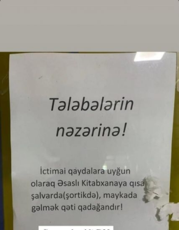 Bildiyiniz kimi daxili nizam-intizam qaydaları hər müəssisədə var. Bu, istər iş yeri olsun, istərsə də təhsil müəssisələri. Hətta bir çox inkişaf etmiş dövlətlərdə belə ictimai yerlərdə dress-kodlar olur. Biz də həmçinin tələbələrimizə belə bir dəvət olaraq yazmışıq ki, müəyyən etik qayadalara riayət edək. Bizim universitet olaraq məqsədimiz tələbəyə təhsil verməkdir. Kitabxana çox özəl olan hissələrimizdəndir. Buna əsasən, belə bir elan hazırlayıb yerləşdirmişik.