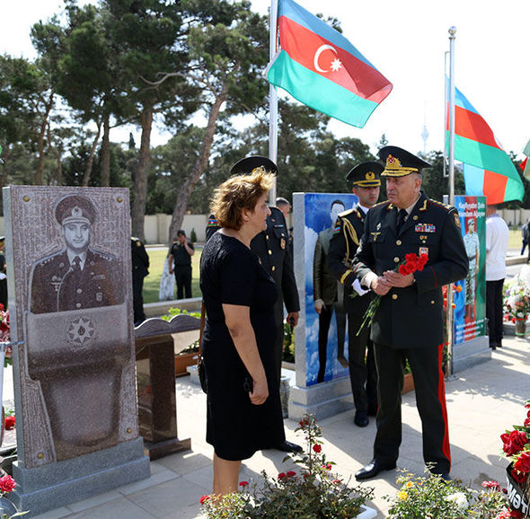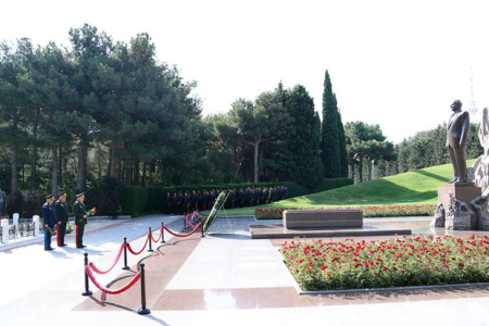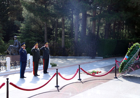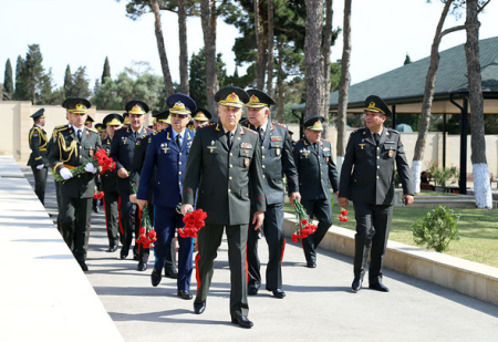 Sonra Müdafiə Nazirliyinin rəhbərliyi İkinci Şəhidlər xiyabanına gələrək ölkəmizin suverenliyi və ərazi bütövlüyü uğrunda gedən döyüşlərdə canlarından keçmiş şəhidlərimizin məzarlarını ziyarət edərək üzərinə gül dəstələri qoyub.