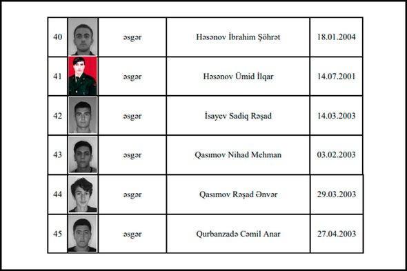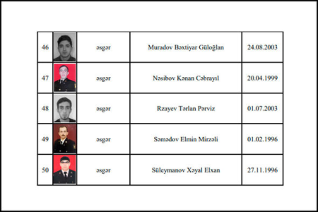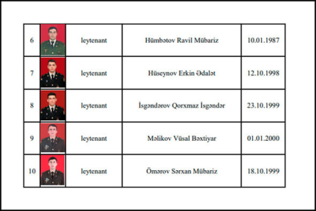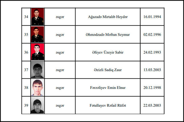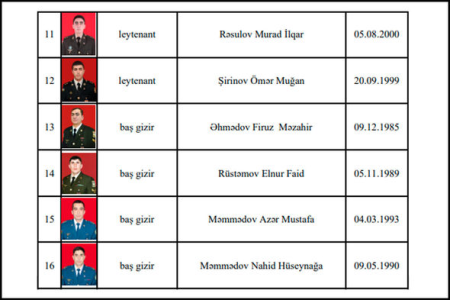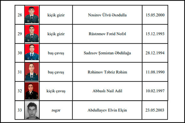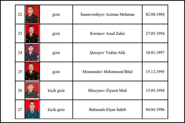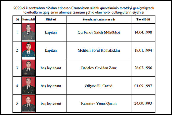 Müdafiə Nazirliyi sentyabrın 12-si gecə və 13-ü səhər saatlarında Ermənistan silahlı qüvvələrinin törətdiyi təxribatların qarşısının alınması zamanı şəhid olan hərbi qulluqçuları siyahısını yayımlayıb.