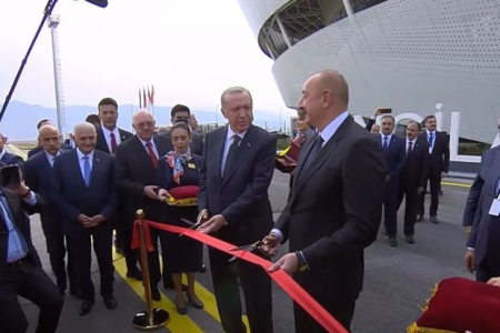 Azərbaycan və Türkiyə prezidentləri hava limanının rəmzi açılışını bildirən lenti kəsiblər.