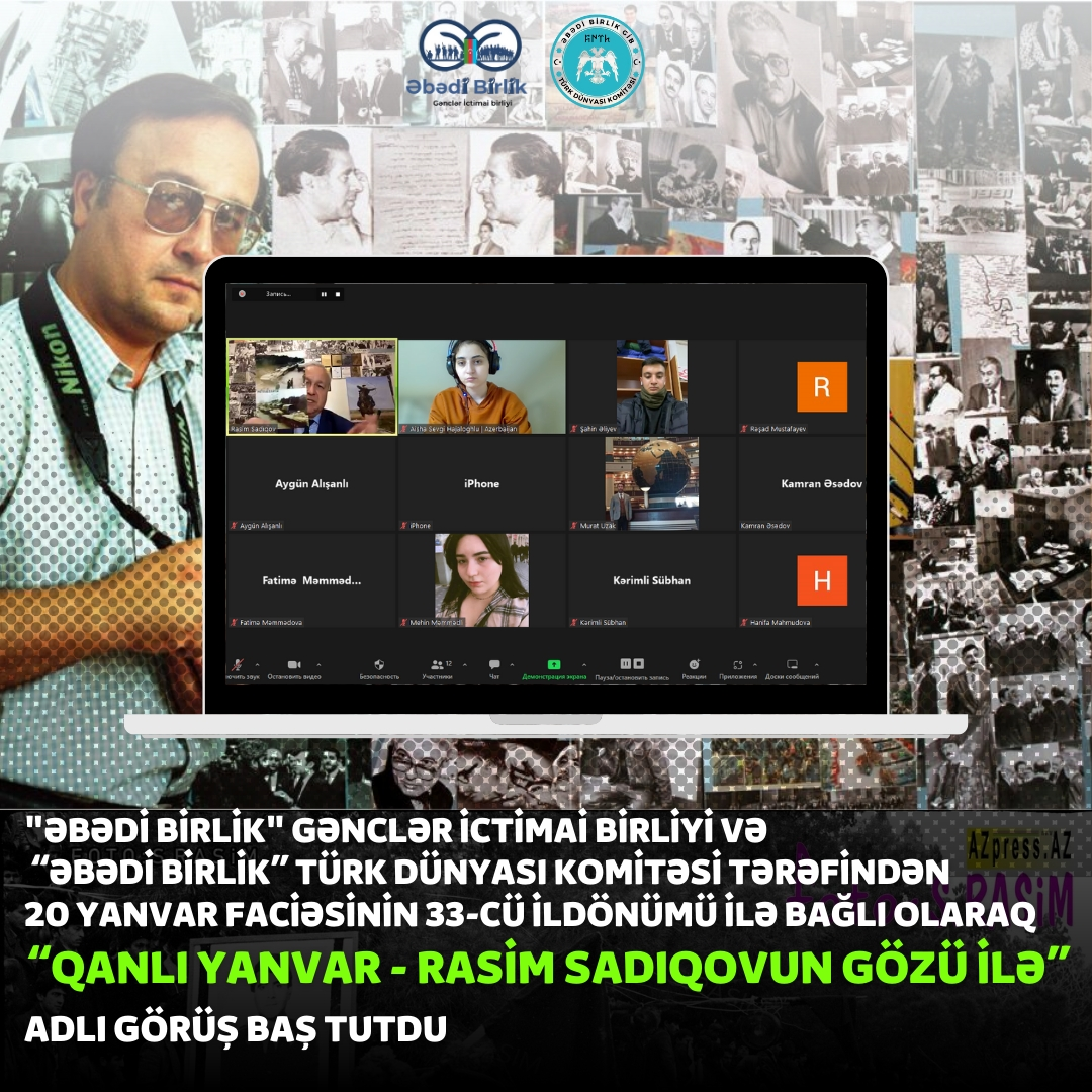 "Əbədi Birlik" Gənclər İctimai Birliyi və “Əbədi Birlik” Türk dünyası komitəsinin təşkilatçılığı ilə "Qanlı Yanvar - Rasim Sadıqovun gözü ilə" mövzusunda Zoom platformasında görüş keçirilib.