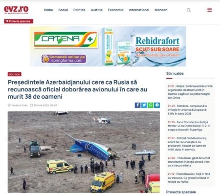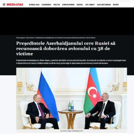 Turkdunyasi.az AZƏRTAC-a istinadən xəbər verir ki, Rumıniya media orqanları o cümlədən, AGEPRES milli xəbər agentliyi, "Evenimentul Zilei" və "Mediafax", həmçinin Bolqarıstanın BTA xəbər agentliyi, "24 chasa" və digər nəşrlər bildirirlər ki, dövlət başçısı Rusiyanın Azərbaycanın sərnişin təyyarəsini vurduğunu rəsmi şəkildə qəbul etməsini vacib hesab edir.
