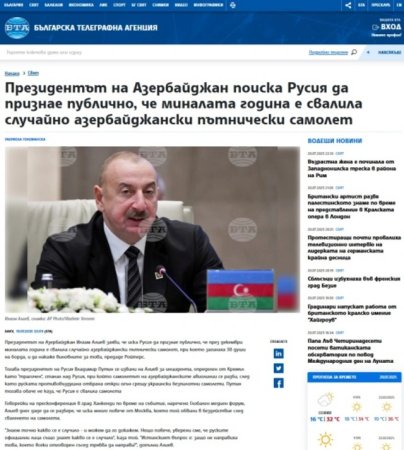 Rumıniyanın və Bolqarıstanın nüfuzlu media orqanlarının yaydığı məlumatlara görə, Azərbaycan Prezidenti İlham Əliyev 2024-cü ilin dekabrında baş vermiş təyyarə qəzası ilə bağlı Rusiya Federasiyasından rəsmi etiraf tələb edib. Qeyd olunur ki, Prezident bu barədə Şuşa şəhərində keçirilən III Qlobal Media Forumunda çıxışı zamanı danışıb.
