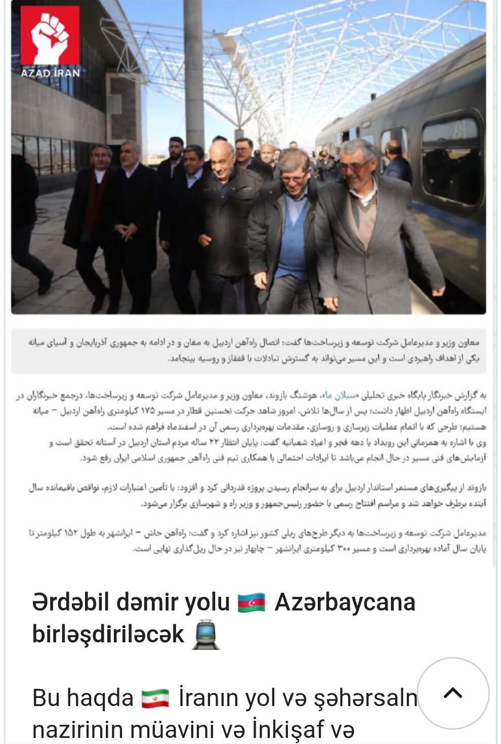 "Ərdəbil dəmir yolu Azərbaycana birləşdiriləcək".