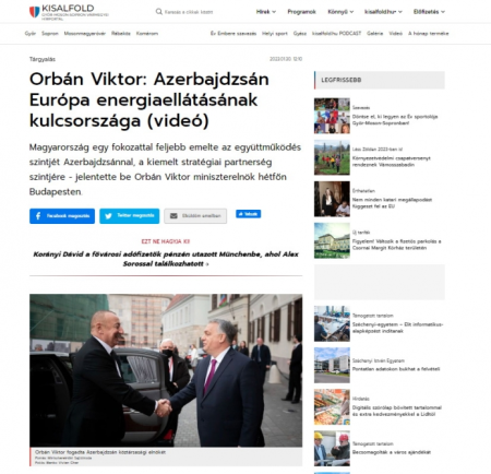 “szoljon.hu”, “kisalfold.hu”, “rtl.hu” portalları isə Azərbaycan Prezidentinin Macarıstanın Baş naziri Viktor Orban ilə görüşlərində, mətbuata bəyanatda səsləndirdikləri fikirlərə diqqət çəkiblər. Qeyd olunub ki, bu gün Azərbaycan Avropanın enerji təhlükəsizliyinin təmin olunmasında əsas aktora çevrilib.