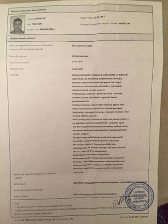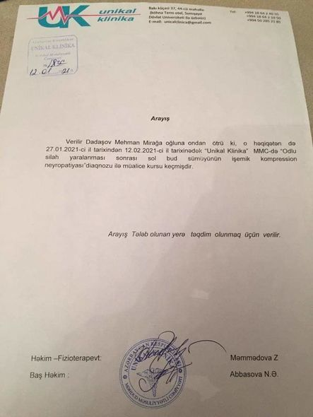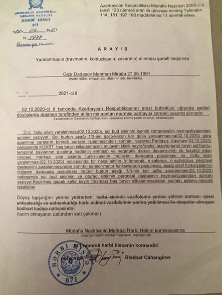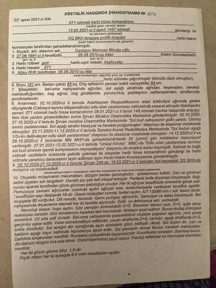 “2020-ci ilin oktyabrında minaatan atəşi nəticəsində qəlpə yarası aldım, lakin buna baxmayaraq döyüşü davam etdirdim. Az sonra ayağımdan da güllə yarası aldım. Müalicə üçün Füzuli rayonundakı xəstəxanaya, sonra Beyləqana, oradan isə Şirvan rayonuna göndərildim. Uzun müalicədən sonra Müdafiə Nazirliyinin Mərkəzi Hərbi Klinik Hospitalına təyinat aldım və 2021-ci ilin mart ayında hərbi həkim komissiyasının qərarı ilə ehtiyata buraxıldım. Mən Buzovnadakı Tibbi Bərpa Mərkəzində, həmçinin Sumqayıtda “Unikal” klinikasında müalicə almışam.