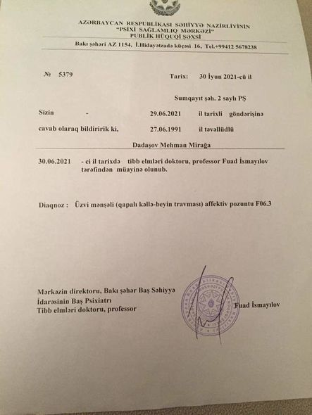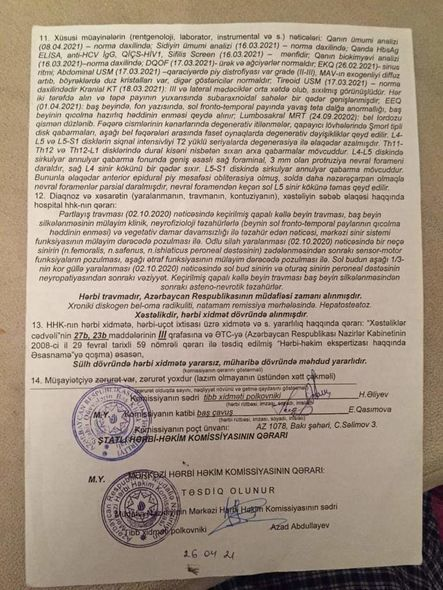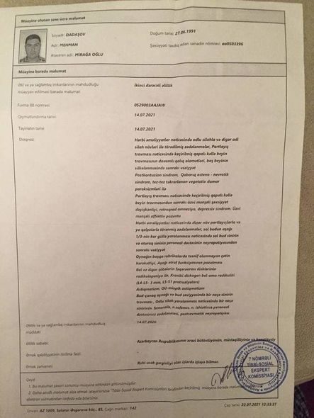 Tibbi-sosial ekspert komissiyası mənə səhhətimə görə işləməyə əks-göstəriş olan II qrup əlillik təyin etdi. Mənə qapalı kəllə-beyin zədəsi, kontuziya, amneziya, həmçinin sol ayağın sinirlərinin və qan damarlarının sıxılması nəticəsində aşağı ətrafın sıxılma-işemik neyropatiyası fonunda astenik nevroz sindromu diaqnozu qoyuldu. Mən hazırda çətinliklə hərəkət edirəm.