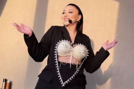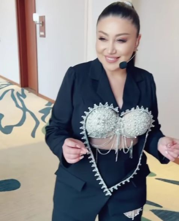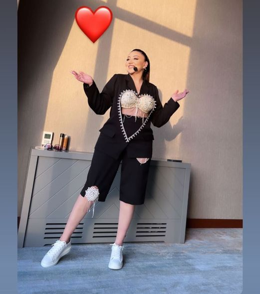 İfaçı səhnəyə xüsusi tikilmiş pencəkdə çıxıb, pencəyin altından isə parıltılı daşlarla bəzənmiş büstqalteri görünüb.