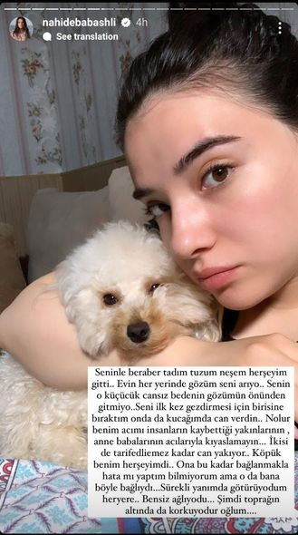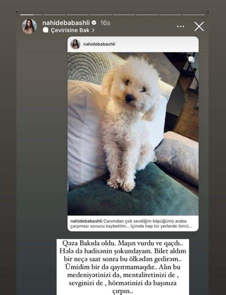 “Canımdan çox sevdiyim Köpüyümü avtomobil qəzasında itirdim. Nə yazsam, nə desəm kədərim azalmır. İlk dəfə gəzdirməsi üçün birinə verdim, onda da qucağımda can verdin. Köpük mənim hər şeyim idin”.